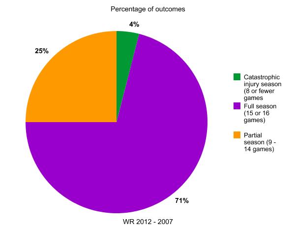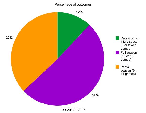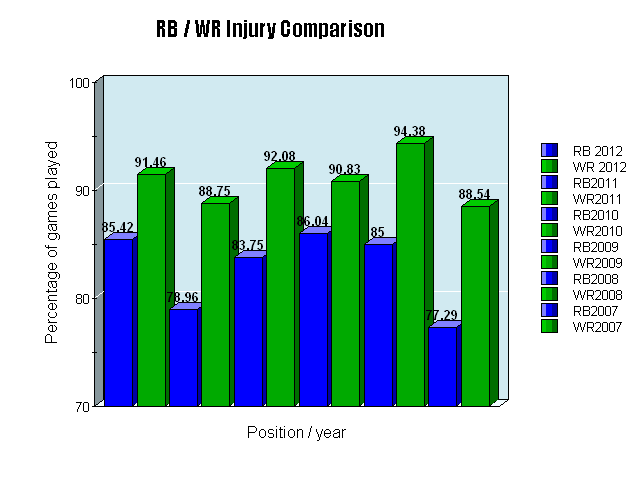 In the six years that were sampled, the highest total number of games played by the running backs group was fewer than the lowest total number of games played by the wide receivers group. Running backs are markedly more likely to play a full season and markedly more likely to suffer a catastrophic injury that costs them half of the season or more.